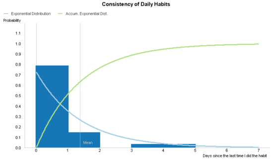 The blue bars represent the past behavior and is the actual data I’ve collected about how frequently I exercise. The actual data is based on my behavior during one month. During that month and according to the chart, I’ve exercised daily 80% of the time and I’ve missed 1 day 15% of the time. I’ve also missed 4 or 5 days 5% of the time. In this way, I can visually confirm that my consistency to exercise resembles an exponential curve and that I can use the exponential distribution to predict my future behavior.